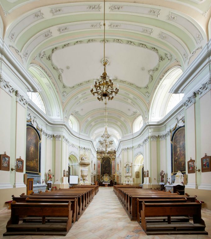 Szentháromság-oltár és festmény. A kép középtengelyében a földgolyón ülő Atya és a felhőkön trónoló Fiú, fejük fölött pedig a Szentlélekre utaló galamb jelenik meg. Alakjukat angyalok és puttók serege veszi körül, egyikük kezében keresztet tart.